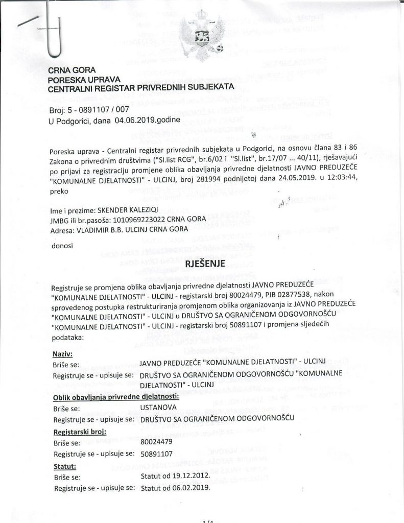 Propisi Rješenje o registraciji DOO “Komunalne djelatnosti” Ulcinj Posted 17/06/2019 jpkdulcinj Post Views: 844